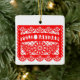This Christmas ornament features a red papel picado Mexican banner with the phrase Feliz Navidad on the front in bright white. The back has a place to customize with a family name and the year in a red slab serif font.