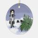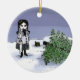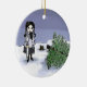 This holiday ornament has a sinister little girl felling a holiday tree with a saw.