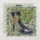 This invitation is decorated on the front with a brand new military boot, a black female recruit, and the words "Please Join Us At An Army Boot Camp Going Away Party" superimposed on a camouflage background.