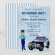 Retirement invitation for a retiring lady police officer. Design has a police car and a police officer with the words you are invited to a retirement party. Easy to customize with your party details.