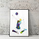 Dynamic watercolor-style silhouette of a female volleyball player in mid-jump, ready to spike the ball. The vibrant color splashes convey energy, motion, and confidence, making it a striking wall art for sports enthusiasts.