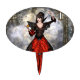 3D digital render of a beautiful female wizard in a red and black dress with wings on a fantasy spooky castle background