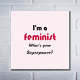 "I'm a feminist, What's your Superpower?" A fun slogan with a serious message. The text is in bold black lettering on a pale pink background, with 'feminist' in deep pink for contrast. Challenging and empowering.
