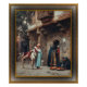 This is classical orientalist style genre scene of people in possibly a North African village with a center focus of a young man that is a servant to a prominent lady of the village...