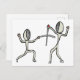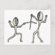 Fencing design shows two dueling experts with epees and masks - demonstrating thrust and parry stances. Cool graphic for fencing enthusiasts.