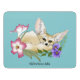 A cute fennec fox curled up with flowers in a backdrop of blue