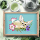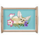 A cute fennec fox curled up with flowers in a backdrop of blue