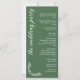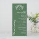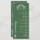 Elegant 9x4 wedding program in fern green with an arch shaped laurel wreath monogram and beautiful fonts in white. Fern green wedding program with a greenery monogram, the branches shaped like an arch, and beautiful fonts. Flat wedding program in green with an elegant monogram in white and beautiful fonts and greenery details in white against a green background.
