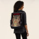 This Bold Face adult backpack with a interchangable front face has a ferocious looking Asian striped tiger head outlined in red with Asian symbols on his eyebrows on a black background with red dots. Customize your name with the template.