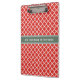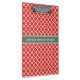 As you can see, this design showcase a personalized Moroccan quatrefoil pattern on both sides of the clipboard. The elegant trendy ferrari red background seamlessly harmonizes with the crisp white quatrefoil graphic. Placed just below the center on the front, a sage green rectangle space, bordered by slender white lines, provides ample room for customization. Whether it's your name, company slogan, or a cherished quote, this design invites personal expression. The fonts and colors are meticulously selected to resonate with modern aesthetics, suitable for diverse uses.