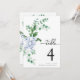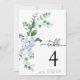 These table numbers feature a watercolour blue hydrangea design with a hand-lettered script font. The script heading is an image that cannot be edited. All of the other text is fully editable. For more advanced customization of this design, simply select the "Customize It" button above.