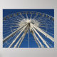 A white framed ferris wheel seen from below its legs, with cars silhouetted against a deep blue sky.