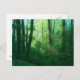 Rays of the morning sun streaming into a brilliantly green summer forest, with massive ivy-covered trees and a thick blanket of underbrush. A photograph digitally manipulated to give the over-grown vines, blue-green mist, golden god-rays, and spring green tree leaves a dream-like quality.