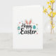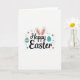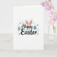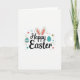 This design shows a white background with a dark, flowing inscription centered on the card, giving the layout a graceful focal point. Just above the lettering, a pair of simple bunny ears 🐰 rises into view, outlined in olive green with soft salmon-pink inner shapes, like a gentle peek over the words. On the left of the text sits an egg shape filled with calm horizontal stripes in teal, soft pink, and light blue, adding a quiet, friendly touch. On the right, a second egg balances the scene with a teal fill and small white polka dots, like a cheerful companion to the striped one. The text is placed in the middle and appears in a deep charcoal tone, standing out clearly against the open white space. Around the main elements, scattered circles in teal, muted olive, and warm coral create a light confetti effect, as if the eggs are being celebrated together 🌷. The bunny ears hover neatly above the inscription while the dotted and striped eggs sit on either side, framed by the sprinkled dots.