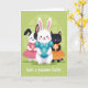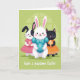 This card shows three human-like animal friends gathered close, sharing a tender, friendly energy as they present decorated eggs 🐰. In the center, a fluffy white rabbit with tall ears and rosy cheeks holds several bright blue egg shapes arranged like a paw print, drawing the eye to the middle. On the left, a black-and-white bunny in a pink dress cradles a textured rosy egg, angled slightly toward the central rabbit as if admiring the display. On the right, a sleek black cat with pointed ears in an orange outfit holds a textured golden-orange egg, leaning in to complete the balanced trio 🐇. The background is a soft pastel green with a faint grid pattern that keeps the setting calm and springlike. Soft lighting and gentle color contrasts—pink, orange, blue, and green—give the scene a cozy, affectionate look without feeling busy. A short line of text sits along the bottom in a darker contrasting color, centered beneath the characters. The rosy and golden eggs have a speckled, raised look, while the blue eggs appear smooth and glossy.