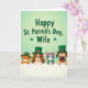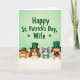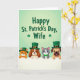 Designed with four cute cartoon animals—two cats and two dogs—peeking over a wide white banner, this card shows them leaning in close as if sharing a friendly secret. Their big eyes and gentle smiles, with paws resting along the top edge of the banner, add a cozy, affectionate touch between the group. The background is a soft green gradient that shifts from a lighter mint tone near the top to a deeper leafy green near the bottom, setting a festive spring-holiday mood 💚. Each animal wears a green top hat with a gold buckle, and one gray cat also sports a neat green bow tie for an extra dash of charm. Across the upper area, a cheerful greeting appears in large, rounded letters, colored in a deep green that stands out against the lighter background. Small three-leaf clover icons ☘️ sit near the text like tiny accents, balancing the layout without crowding it. The animals stay clustered along the lower portion, creating a sweet “all together” feeling as they peek over the bright banner. The hats are a rich emerald green with shiny gold buckles, and the banner remains plain white beneath their paws.
