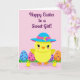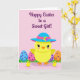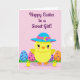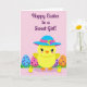 This design shows a sunny yellow, round little bird in the center, wearing a wide-brim hat with a bright blue top, a pink band, and a tiny cluster of flowers, giving it a sweet, dressed-up look 🌷. Its soft pink cheeks and big eyes with dark lashes seem to glance warmly outward, like it’s greeting someone it cares about. Behind it, several oversized decorated eggs sit in stylized green grass, arranged so the scene feels balanced and cozy. The eggs are colored in pale blue, pink, and orange, with contrasting polka dots that add a light, festive texture. Two smaller yellow birds stand in the foreground near the main bird, close enough to suggest a gentle, friendly togetherness 🐰. The background is a pale rose tone that makes the bright yellows and pastels stand out without feeling harsh. Near the top, a seasonal greeting is placed overhead in deep purple lettering, centered above the characters. The hat’s flower detail shows multiple colors in small petals sitting just off to one side of the crown.