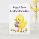 This card shows a plump yellow baby bird centered in the lower half of a bright white background, with rounded shading that makes it look soft and cuddly. Its rosy cheeks and wide eyes give it a gentle, affectionate look, as if it’s sharing a sweet moment with the viewer 🐰. Near the top, a flowing purple line of text announces the Easter message, spaced comfortably so the design feels open and airy. The lettering sits above the bird like a cheerful header, and the deep purple color ties in with the main decoration below. In the bird’s little wings, a purple egg with dotted spots is held close, adding a tender, friendship-like touch as if it’s presenting a small gift 🐇. Around the bird’s feet, small spring flowers in yellow and white dot the ground, with thin green stems that keep the scene light. The colors stay mostly sunny yellow, purple, and soft green, keeping the focus on the bird and its offering. A cluster of tiny blossoms rests along the bottom edge beneath the bird’s rounded belly.