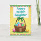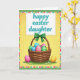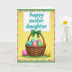 This design shows a sunny yellow background with a woven basket centered on a small patch of green grass, dotted with tiny spring flowers 🌷. The basket is filled with colorful patterned egg-shaped forms, shaded with smooth gradients that make them look softly rounded. A bright green bow sits at the top of the basket, like a little gift-tie that draws your eye. Two more egg-shaped decorations rest nearby—one pink and one golden—leaning close as if keeping each other company 🐇. Above the basket, a white rectangular sign floats with a dashed stitched-style border, giving it a cozy, crafted look. The message is placed in the middle of that sign in aqua lettering, with flowing strokes that feel gently affectionate. Around the scene is a border of small rectangular color patches in light and bright tones, finished with a soft green outer edge.