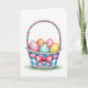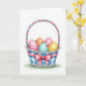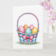 This design shows a woven picnic basket centered on a white background, resting on a thin strip of soft green grass, with a gentle watercolor look that feels sweet and friendly 🌷. The basket is covered in a blue-and-white gingham pattern, with pale edging along the rim and base that adds a tidy, textured finish. A pink ribbon wraps the front and ties into a bow, like a small romantic gift waiting to be noticed. The handle arches overhead, twisted from pastel pink and light blue strands, giving the scene a light, affectionate touch. Inside sit five decorated egg shapes, each with its own pattern—floral motifs on pink, white stripes on orange, tiny blossoms on turquoise, and zigzags plus small starburst accents on yellow 🐰. Near the top of the card, a short Easter greeting appears in a soft pastel tone, with smaller matching text placed neatly beneath it. The eggs cluster closely together in the basket, with the pink bow centered below them and the handle curving above.