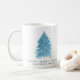 Festive Blue Christmas Tree Watercolor Holiday Mug. Happy, merry jolly and your family name - add your text. Blue watercolor drawing of a Christmas tree. Festive and tender design for the Christmas.