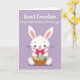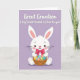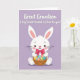 This card shows a sweet white rabbit centered on a light lavender background, drawn with round dark eyes and rosy cheeks that give it a friendly, affectionate look 🐰. Its upright ears have soft pink inner shading, and the gentle tilt of its head suggests it’s offering a small springtime gift to someone it cares about. A bright pink bow sits at its neck, adding a cheerful accent against the pale fur. The rabbit sits while holding a rustic woven basket close to its body, as if hugging it before sharing what’s inside. The basket is filled with smooth pastel ovals in yellow, green, blue, and pink, arranged like a tidy little treasure mix 🌷. Above the rabbit, a short greeting appears in white cursive-style lettering, centered near the top with plenty of open space around it. A faint shadow beneath the rabbit adds a touch of depth, and the lavender backdrop stays plain and uncluttered behind the figure. The bow’s pink stands out sharply, and the basket weave is shown with small curved lines along the front edge.