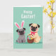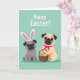 Designed with a soft pastel teal background, this card shows two stylized, short-snouted dog companions posed along the lower half, gazing outward with wide, glowing eyes that feel like a friendly hello. Across the top, a large seasonal greeting sits centered in thick white lettering, standing out clearly against the cool backdrop. On the left, a gray pup wears long pink-and-white bunny ears 🐰, leaning slightly toward its companion as if sharing a private joke. On the right, a cream-colored pup with a bright pink bow at its neck holds a woven basket close to its chest, the gentle grip suggesting a caring, “I brought these for you” kind of moment. Both pups have small rosy blush marks on their cheeks, adding a touch of bashful affection without needing any extra fuss. The illustration stays flat and simple with minimal shading and smooth outlines, keeping the focus on their tender poses and the festive details. In the basket, patterned eggs in cheerful colors peek out above the rim, with a few tiny decorative accents that echo springtime 🌷.