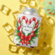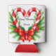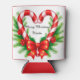 A vibrant Christmas-themed composition featuring candy canes forming a heart shape surrounded by evergreens, red bows with gold accents, and festive holly berries.