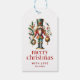 This festive holiday gift tag design showcases a colorful Christmas Nutcracker and elegant "Merry Christmas" retro typography, with red and white reversed colors on each side of the tag.