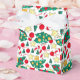 A playful Christmas pattern filled with cute cartoon elements like tiny trees, yellow stars, red ornaments, candy canes, wrapped gifts, and decorated branches. The bright red, green, and yellow tones create a joyful holiday look, perfect for party favors and seasonal celebrations.