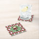 Colorful festive pulp board paper coasters done in a muted red, green, and white argyle pattern. A cute Santa Claus, holding a little Christmas tree, is set in a green circle, in the middle of the coaster. Customize to add text to this fun coaster. Great for parties, holiday season, and gift giving.