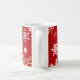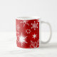 White and red snowflakes on a red background on a coffee mug to personalize with a name. The name will be a bit off center as I tucked it in where i fits. A nice idea for a holiday tablescape would be to have personalized mugs as seating place assignments, and then they can serve as gifts for the guests.