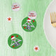 This table confetti has large green circles with gold flecks and a funny skeleton holding shiny ornaments up to his eyes wearing a Santa hat accented with red stars. Medium circles are a white circular pattern with red Merry Christmas text. Small circles are snow white with red and gold stars.