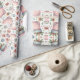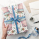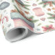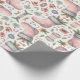 This delightful wrapping paper showcases a whimsical pattern filled with holiday cheer. Adorned with a soft pink stocking, decorated with greenery and cinnamon sticks, it features beautifully wrapped gifts, candy canes, and ornaments, capturing the essence of a magical Christmas celebration.