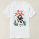 This image shows a white t-shirt featuring a cartoon black and white cow wearing a Santa hat. The text "Merry Christmas" is written in festive red and green lettering above the cow, surrounded by snowflakes and swirls. The cow stands among stylized green Christmas trees, creating a cheerful holiday theme.