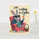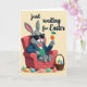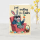 This card shows a grey-furred, human-like bunny lounging in a coral-red armchair 🐰, wearing dark sunglasses, a blue blazer, a green plaid vest, and a pink bow tie. The bunny’s slightly open smile and relaxed posture suggest an easygoing charm, like it’s sharing a quiet, friendly moment with someone nearby. In one paw, it holds a stemmed glass filled with an orange drink topped by a tiny green umbrella, adding a light, party-ready touch. The background is a soft, creamy yellow that gives the whole scene a warm glow without distracting from the main figure. On the right side sits a woven basket packed with speckled eggs in gentle pastel blues, pinks, oranges, and greens 🌷. A few eggs rest on the floor in front of the chair, scattered as if they were just set down during a casual visit. Across the top, a short holiday greeting appears in flowing black lettering against the pale background.