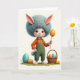 This design shows a cute, human-like bunny character with a bright white face, a big pale-blue puff of hair, and long blush-pink ears reaching upward 🐰. Its amber eyes and rosy cheeks pair with a small smile that feels like it’s meant for a close friend standing just out of frame. The bunny wears an orange top under deep green overalls, centered on a soft ivory background with gentle, diffused light. Near the top, simple Easter lettering sits in a soft pastel tone, laid out in a neat line above the character. One paw lifts a golden-yellow egg on a thin stick, decorated with lively stripes like a sweet treat on display 🐇. At the bunny’s feet, a woven basket is filled with more eggs in shades of blue, orange, and teal, each marked with small patterns. A little patch of green grass grounds the scene beneath the basket and the character.