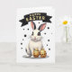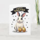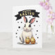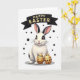 This design shows a front-facing long-eared bunny 🐰 in mostly white, with black accents around its wide eyes and at the tips of its tall ears, as if it’s pausing to meet your gaze. A small pink nose and slightly open mouth add a friendly, inviting expression, while its orange eyes look bright and attentive, like it’s sharing a quiet moment with you. Resting close at its feet are two golden, egg-shaped decorations covered in black stripes, dots, and simple geometric marks, positioned like a pair meant to be found together. Near the top, a black ribbon banner stretches across the page with a short Easter greeting in gold letters centered on the banner. The background stays white, keeping the focus on the characters and the eggs, with a few scattered black circles that read like light confetti. Gentle shading gives the bunny and eggs a subtle sense of depth without adding extra clutter. Small black dots and circles float around the white space 🌷.