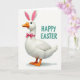 This greeting card features a white water bird, like a goose or duck, set against a plain white background. It wears tall pink bunny ears 🐰 and a neatly tied pink bow at its neck, giving it a sweet, friendly look. Soft shading across the feathers adds gentle depth, like a tender spotlight that makes the character feel warmly present. The beak and webbed feet are a bright orange, standing out clearly against the white body and adding a lively spring contrast. Dark, shiny eyes face forward with an inviting expression, as if ready to share a quiet, affectionate moment. To the right of the bird, a short Easter message appears in green letters, placed at mid-height so it balances the character. The simple layout leaves plenty of open space, with the pink and green accents suggesting fresh spring touches 🌷. The pink ears tilt slightly upward above the bird’s head, and the bow’s loops and tails sit centered under its beak.