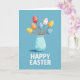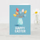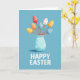 Designed with a light blue vase centered near the top, this digital illustration shows a bouquet-like cluster of patterned egg shapes on thin sticks, arranged like a friendly offering 🌷. The eggs vary in color—reds, oranges, yellows, blues, and whites—and their close spacing feels like a small group leaning in together, adding a gentle, companionable mood. Some eggs have polka dots, others have stripes, and a few include tiny accent marks that make each one feel distinct while still part of the same bunch 🐰. The vase carries small white decorative motifs that resemble delicate flakes, giving the surface a soft, textured look. Behind everything sits a smooth azure background that stays simple so the vase and egg shapes stand out clearly. Along the lower portion of the design, a rounded white greeting is placed in large letters, centered beneath the vase. The letters are thick and easy to read, with the bright white contrasting strongly against the blue field. The upper area is filled by the vase and egg bouquet, while the bottom area is anchored by the centered white text on the blue background.