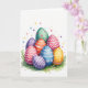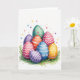 Soft colors and a watercolor-style scene place a clustered group of decorated egg shapes near the lower center, arranged close together like friends leaning in for a photo 🐰. Each egg carries its own pattern—horizontal stripes, zigzags, and polka dots—so the designs seem to “chat” with one another through repeating lines and dots. The palette moves through pink, purple, blue, orange, yellow, and leafy green, with gentle gradients and softened edges where the paint looks slightly washed into the paper. Beneath the eggs sits a layer of green foliage dotted with small round accents, adding a fresh spring garden setting 🌷. The white background stays open and airy, while scattered confetti-like specks in matching colors drift around the cluster. There is no headline above, but any greeting would sit nicely in the upper half, centered, in a soft gray or light lavender to keep the focus on the artwork. Fine details show up in the tiny dots and the alternating stripe widths, giving the eggs a tender, companionable closeness. A sprinkling of small colored circles floats across the white space, especially around the top and sides of the egg cluster.