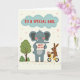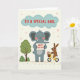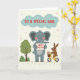 This greeting card features a stylized gray elephant centered on a creamy, lightly textured background, with rosy cheeks and a gentle smile that feels like a friendly hello. The elephant lifts a crisp white sign above its head, and the greeting is set in bright red letters across the middle of the sign. On the left, a simple green tree with a sturdy brown trunk stands beside small shrubs, adding a calm, outdoorsy balance. On the right, a long-eared brown bunny 🐰 pedals a sunny yellow bicycle, leaning forward as if hurrying to meet someone, with a front basket stuffed with red and yellow flowers 🌷. Above them, a soft blue cloud stretches like a banner, carrying an affectionate message in red text near the center. Tiny dots in pink, green, orange, and blue are sprinkled around the scene like confetti across the background. The bicycle’s black wheels and curved handlebars stand out against the pale backdrop, and the flower petals peek over the basket rim in little red and yellow bursts.