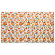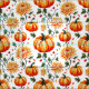 Fabric in a fall-themed pattern featuring vibrant orange pumpkins intertwined with blooming chrysanthemums in warm yellow and orange hues, creating a festive harvest-inspired design