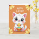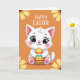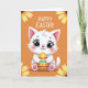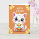 This card features a cute, stylized white kitten with pink inner ears and paw pads, holding a decorated golden oval like a treasured spring gift. Its big shiny eyes, long lashes, and rosy cheeks give it a tender, affectionate look, as if it’s saving the surprise for someone special. The background is a rich orange wash that feels sunlit, with sunflower blooms peeking in from each corner to frame the scene like a friendly hug 🌷. Centered near the top, a short Easter greeting appears in white lettering that stands out clearly against the orange. The golden oval is detailed with red and light blue bands plus tiny multicolored dots, adding a festive, sharing-with-you feel 🐰. Soft shading rounds the kitten’s face and paws, and the blush on its cheeks suggests a shy, sweet connection. In the corners, the sunflowers show bright yellow petals around deep brown centers, partially cropped at the edges.
