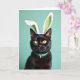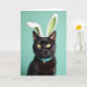 This design shows a close-up portrait of a sleek black cat set against a smooth, soft teal background, with golden-yellow eyes holding a steady, inviting gaze that feels like a quiet hello. White plush bunny ear coverings sit on its head, lined with green gingham that adds a sweet, flirty touch 🐰. Fine whiskers fan out from its muzzle, and the light catches a gentle sheen along the coat, keeping the focus tender and intimate. A slim aqua collar circles its neck, finished with a small gold-toned buckle that glints like a tiny gift. Any greeting text is best placed at the top center in white, with a smaller line near the bottom in matching white to keep the look balanced and calm 🌷. The simple background stays free of extra objects, so the cat’s face and accessories feel like the whole scene is leaning in close. Deep shadows shape the fur while bright highlights sparkle in the eyes and along the buckle. The green gingham inside the ears shows as neat little checks framed by soft white fuzz.