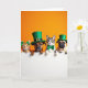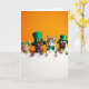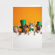 This card shows a snug lineup of four pets—a ginger tabby, a brown dog, a tabby-and-white cat, and a pug—peeking together over a bright white ledge as if they’ve gathered for a friendly secret. Behind them is a solid orange background that makes their fur and green St. Patrick’s Day accessories stand out 💚. The first cat wears a shamrock headband, the dog has a green leprechaun hat with a gold buckle, the second cat sports a shiny green bow tie, and the pug tops it off with a small green hat ☘️. Their paws rest along the edge in a neat row, and their wide eyes meet yours with the kind of shared curiosity that feels like close companionship. Soft, even lighting shows the different fur textures and adds a gentle shine to the hats and bow tie. The greeting text sits on the white area beneath their paws in green lettering, centered so it feels like it’s coming from the whole group. The orange backdrop stays unbroken, framing the four faces and their green accents like a simple stage.
