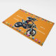 An orange-hued rectangular doormat adorned with a vibrant string of multi-colored Christmas lights along its top and bottom edges. The center features a detailed cartoon illustration of a female motocross rider on her dirt bike. White text on the left reads "Welcome Friends" and on the right, "Merry Christmas," creating a cheerful and personalized holiday greeting.