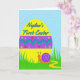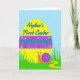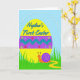 This card features a large sunshine-yellow egg centered on a soft sky-blue background, decorated with a wide purple band, a teal zigzag stripe, and small lime-green dots. Small flower shapes in red, teal, and lime are scattered across the egg, adding a gentle, friendly charm 🌷. Near the top of the egg, a short celebratory line of text sits in flowing lettering, shown in a bright blue outline that stands out against the yellow. Below the egg, an orange snail with curious antennae and a curled violet shell moves through tall, stylized green grass, as if on a sweet little journey toward someone special 🐰. A wavy yellow trail behind it suggests motion and a light, affectionate moment, like it’s bringing a tiny greeting across the scene. Along the upper background, a curved row of small white pearl-like dots frames the egg and guides the eye inward. The egg’s purple band includes a teal zigzag running horizontally with evenly spaced lime dots, while the snail’s violet shell shows a clear spiral near the lower edge.