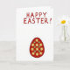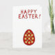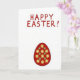 This card features a simple white background with a bright red holiday greeting set across the top in loose, hand-drawn lettering. Just beneath the words, a large red egg shape sits centered, acting as the main focal point. The egg is covered in a repeating pattern of small yellow flowers with white centers, spaced between softer green leaf-like shapes that curve with the surface. The warm reds and sunny yellows create a sweet, friendly mood, like a note shared between close friends over spring treats 🌷. The slightly uneven letter shapes add a human touch, as if the message was written with extra care for someone special 🐰. The text stays in the upper portion while the decorated egg fills the middle, leaving plenty of white space around it for contrast. Tiny petals and rounded leaves alternate across the egg, with yellow blooms popping against the red.
