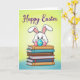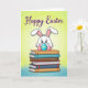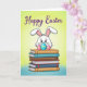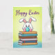 This card shows a fluffy white bunny 🐰 with pink-lined ears and curious dark eyes peeking over the top of a tall stack of books, as if sharing a secret with someone close by. On either side sit two decorated eggs, one with blue and yellow stripes and the other with warm pink and orange bands, leaning in like friendly companions in a cozy scene. The books below create a sturdy little stage, with spines colored earthy brown, calm teal, bright red, and deep blue, adding a quiet, bookish charm to the celebration. The bunny’s gentle tilt and attentive gaze bring a soft, affectionate tone, like a sweet moment between friends during a springtime day 🌷. Near the top, a seasonal greeting is placed in a curved line, written in rich purple lettering that stands out without overpowering the art. Behind everything, the background fades smoothly from lively lime green into airy sky blue, giving the scene a light, fresh glow. Fine outlines define the bunny, eggs, and books while the background stays softly blended, creating depth and contrast. The purple greeting arches above the bunny’s ears, centered over the stacked books and the two striped eggs.